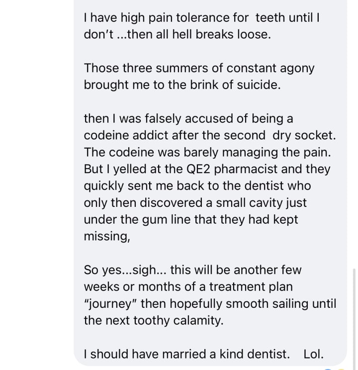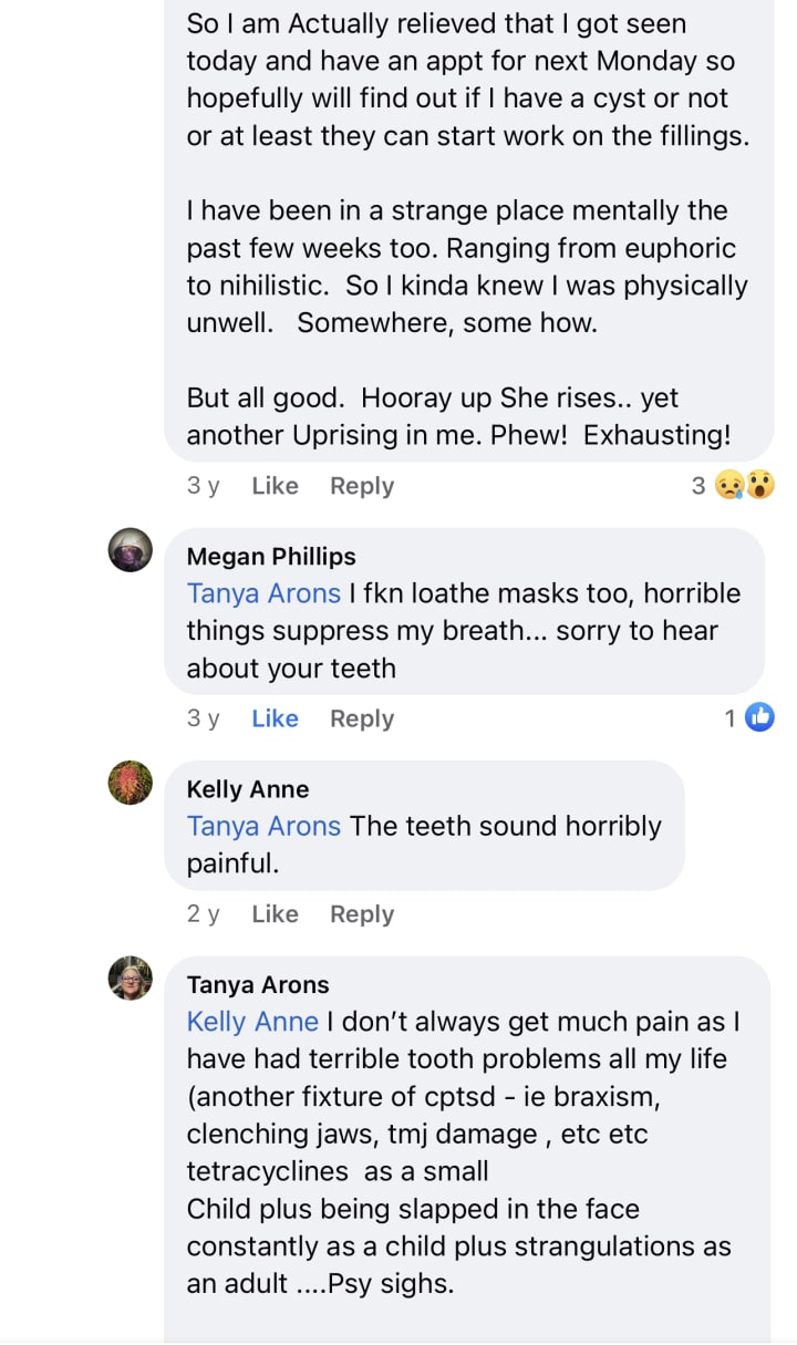I don’t wish that on her, not at all. She was saying things like she felt tortured and can’t go on much more so I know she now fully comprehends why I talk like that when smashed by long periods of cumulative pain and medical interferences.