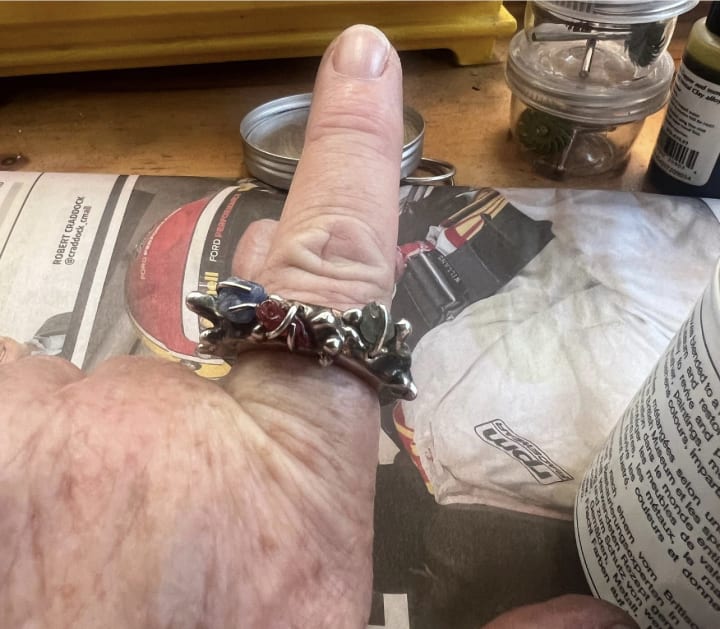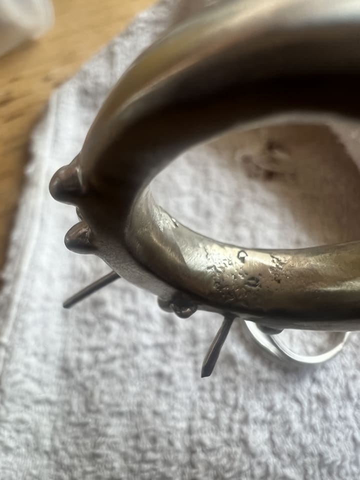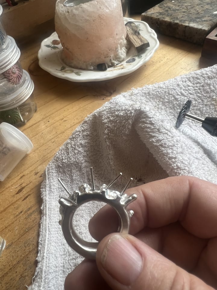 Also …sigh…my attempt at filling the drill holes for the prongs with sterling silver dust. Close but no chocolate fish. But I will wear this in good health and my characteristic defiance. It’s rustic, rudimentary but it’s mine.