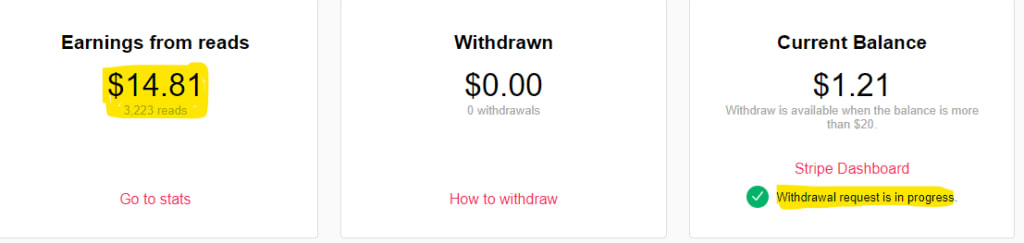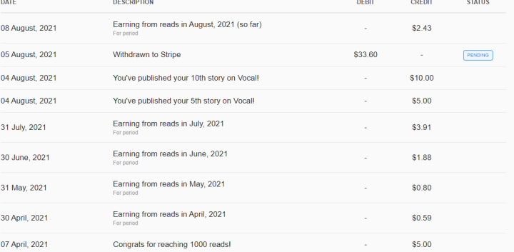 This is because I just earned enough through page views and bonuses to request my first pay-out from Vocal Media. It is currently pending as you can see from the above image.