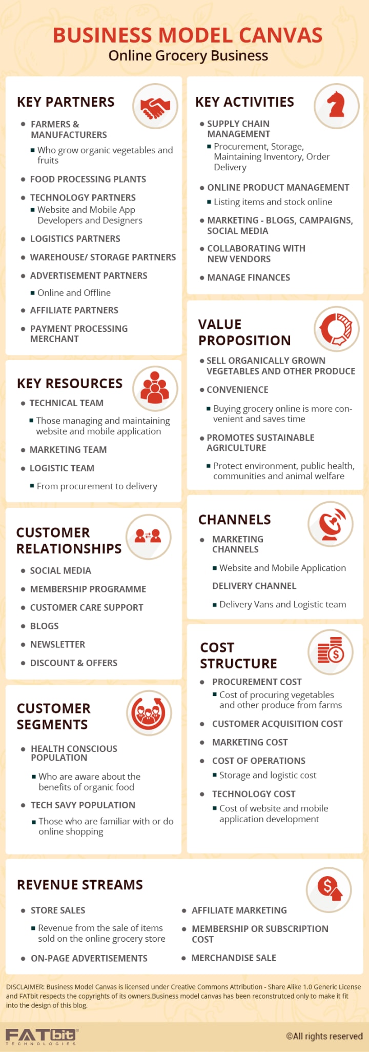 Let’s take a look at the Business Model Canvas of Online Grocery Business: