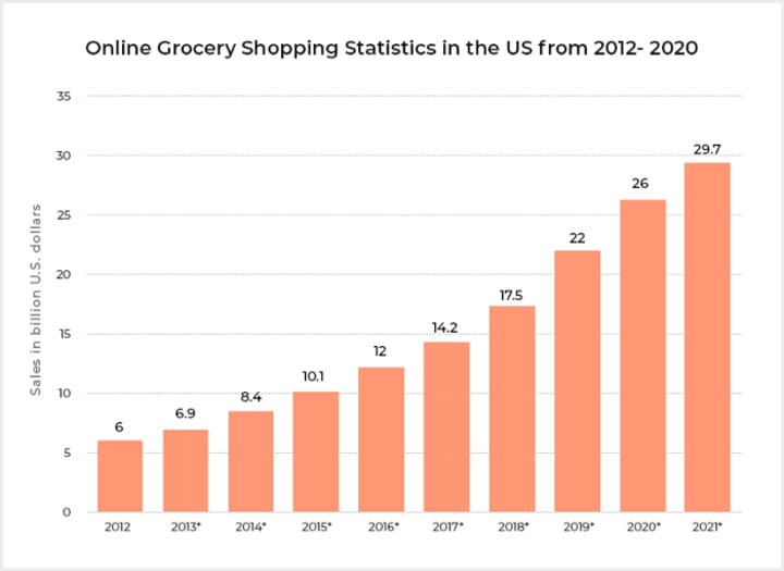 Here is a graph showing the growth of online grocery in the US from the year 2012–2020. It indicates how the industry was growing even before the pandemic hit the world.