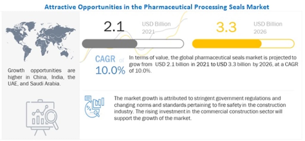 The pharmaceutical processing seals market is projected to grow from USD 2.1 billion in 2021 to USD 3.3 billion by 2026, at a CAGR of 10.0% during the forecast period. Seals are an important part of pharmaceutical equipment and are used for various applications under pharmaceutical industry, such as to prevent contamination and leakage, and to handle friction and abrasion. The properties present in pharmaceutical processing seals such as excellent chemical resistance and stability at extreme temperatures and pressure conditions enable them to be used in different applications. These properties of pharmaceutical processing seals are expected to drive the demand during the forecast period.