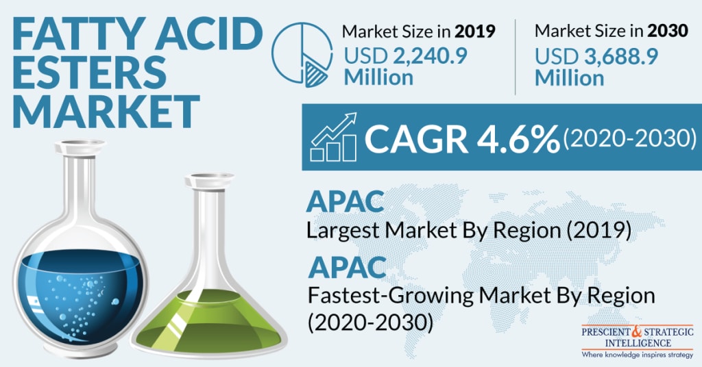 According to P&S Intelligence, the rising demand for personal care and cosmetic products will be a key reason behind the growth of the fatty acid esters market to $3,688.9 million in 2030 from $2,240.9 million revenue in 2019, at a 4.6% CAGR between 2020and 2030. This is because fatty acid esters are vastly utilized in the production of skin creams as a thickener and emollient. Additionally, these chemicals find usage as detergent cleansing agents. The biggest reason fatty acid esters are becoming an important ingredient in the personal care and cosmetic industry is the rising demand for bio-based products.