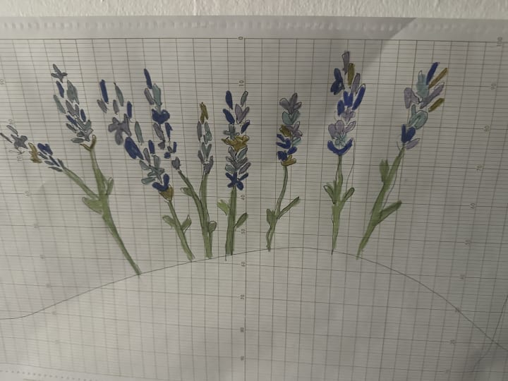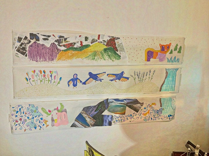 Mountain. Meadow. Lake. Bear. Moose. Birds. The waterfall. Tulips, lavender. Evergreen. I like having my art in the center of my living space. My friend visited and referred to it as my nest, which I never thought of before.