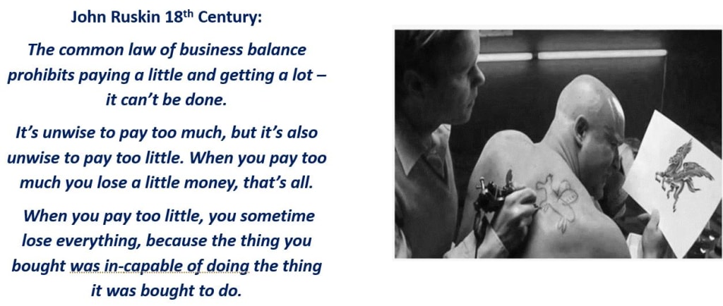 “The common law of business balance prohibits paying a little and getting a lot – it can’t be done. If you deal with the lowest bidder, it is well to add something for the risk you run. And if you do that, you will have enough to pay for something better.” – John Ruskin 18th Century"