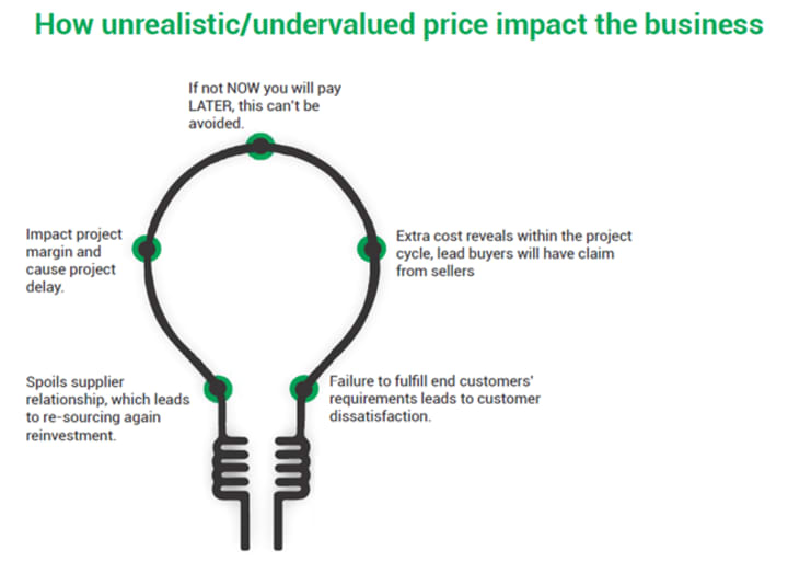 Buyers commit mistakes to define undervalue for their procurement and seller’s decision to accept the price as it’s without analyzing the cost in detail jeopardizes the business. To mitigate this risk, understanding your “should cost” or “idle cost” is essential. It’s very important for either technical or nontechnical buyers to acquire knowledge on their categories they intend to buy. If they can’t, this knowledge can also be sourced from experts.