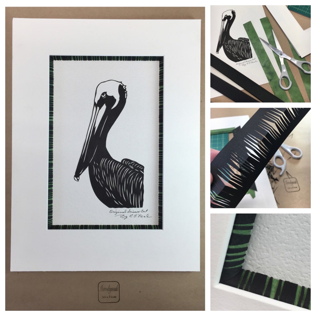 I wondered what it would be like to step into the world of papercraft, to create negative space with scissors and black paper, like Charles. With the cleanest pair of scissors I own, I cut one-inch strips of black Canson paper, folded it in half, and snip, snip, snip. My cut strips are backed with a sap green watercolor background so it feels like bird-watching in the tall ocean grass. This mat not only showcases the work and adds cohesion but will protect the work for years to come. This is my passion. I am a framer. My O'Neal pelican is ready for a frame.