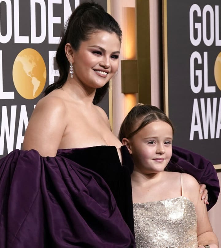 In a move that added layers to the narrative, Gomez chose to share her red-carpet spotlight with an unexpected companion—her 9-year-old half-sister, Gracie. The duo, an embodiment of familial warmth and camaraderie, stood together, their smiles a poignant response to the probing lenses. Gomez's strapless black gown, with its daring thigh-high split and whimsical violet puffed sleeves, became not just a fashion statement but a canvas upon which a narrative of familial bonds and shared joy unfolded.