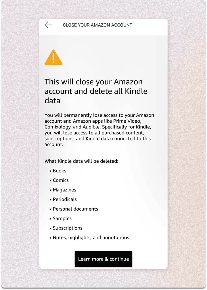 One example is the “roach motel” pattern — where it’s easy to sign up, but nearly impossible to find the unsubscribe button. A telling case: in the past, deleting an Amazon account required going through a multi-step process and even contacting support, which understandably frustrated users.