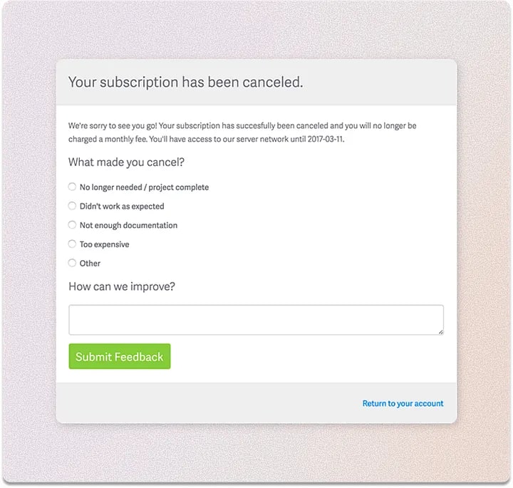 When a customer decides to leave, it’s not just an opportunity to say goodbye — it’s also a chance to gain valuable insight. Why are they leaving? What could be improved? That’s why a small survey about the reason for cancellation is often included as part of the offboarding process.