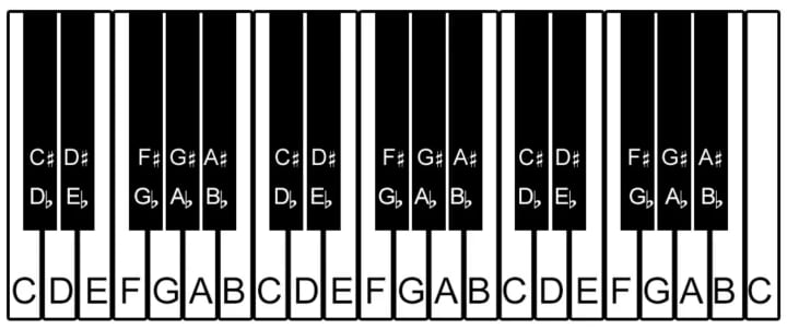 Below we have a diagram of a piano keyboard. We’re using this instrument because all of our notes and their relationships to each other are clearly laid out in front of us. In western music, we tend to group our notes into octaves. Despite the name, an octave consists of 12 notes. The white notes are simply named after the first seven letters of the alphabet, ABCDEFG. The black notes have two names depending on their relationship to the key/tonic note of your piece (we’ll get to that, don’t worry) and which note it is in reference to.