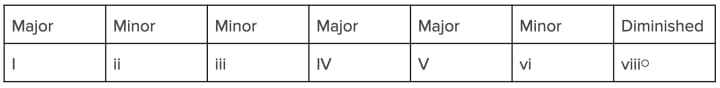A chord is made from two or more notes played at the same time. Musicians use roman numerals to talk about the chords in relation to the key. In a Major key (not scale) the pattern for chords is: