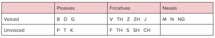 The sounds in the top and bottom rows are the same, except for the ones on top you need to use your voice, and the ones on the bottom you don’t. Plosives expel air outwards, mostly using your lips, fricatives are consonants made mostly inside the mouth but with your lips open and nasals are consonants made with your mouth closed and come from your nose and throat. The best way to understand these is to do them out loud. So go ahead, try and make “D” or “duh” sound without using your voice. Interesting, hey?
