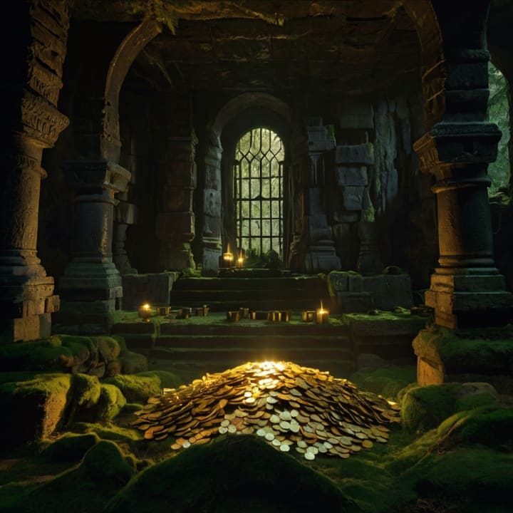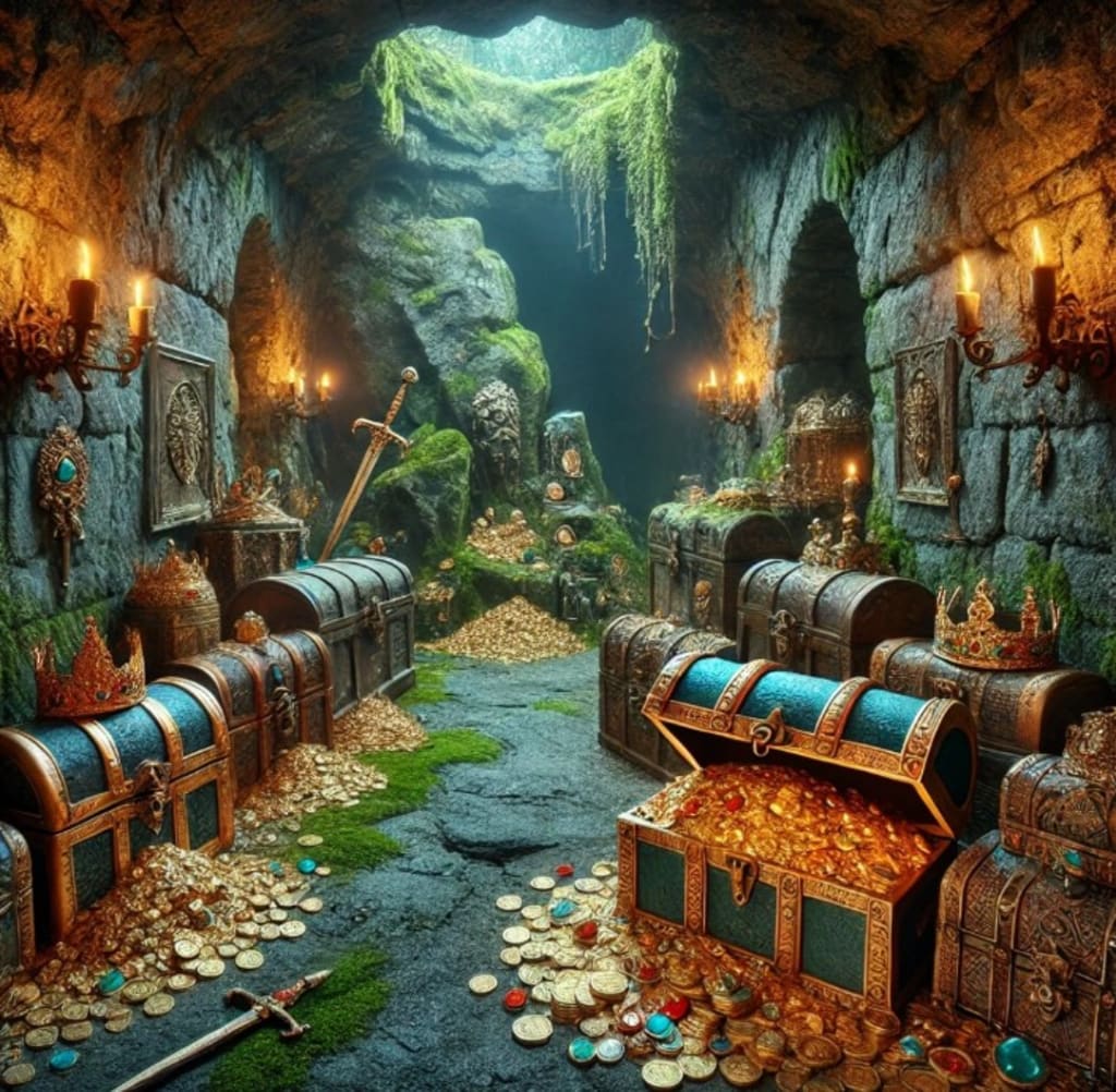 Hidden deep within a long-abandoned forest fort lies the legendary treasure chamber of an ancient king. This hoard, untouched for centuries, gleams with gold, jeweled crowns, and ancient weapons. The eerie glow of flickering light through cracks in the walls hints at the curse that guards the riches, ensuring only the bravest or most foolhardy dare to claim it. Will this treasure bring fortune or doom to its seeker?