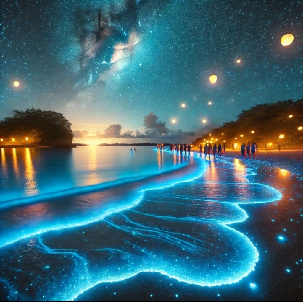 This image captures a breathtaking, magical scene of a glowing beach at night. Bioluminescent blue waves gently shimmer against the dark sand, lighting up the shoreline as a group of people walks peacefully, absorbing the surreal beauty. Above them, golden lanterns float into a starlit sky, merging earth, sea, and heavens in a harmonious display of light and tranquility. This tranquil setting evokes wonder and serenity, where dreams feel tangible under an eternal blanket of stars.