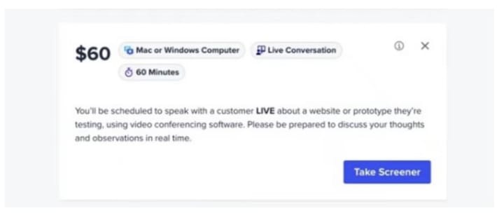 Also, when it comes to your computer make sure it has enough memory and speed to download the UserTesting software and record real-time tests. There are tests that I take from time to time which take about 60 minutes. You earn $60 for doing these tests.