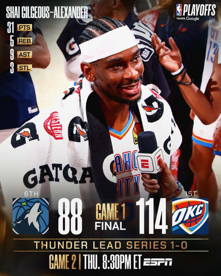 The 2025 NBA Western Conference Finals tipped off with a statement win by the Oklahoma City Thunder, who overwhelmed the Minnesota Timberwolves 114–88 in Game 1 on May 20 at the Paycom Center in Oklahoma City. After a slow first half, the Thunder came alive in the third quarter and never looked back, taking a 1–0 series lead and asserting themselves as serious Finals contenders.
