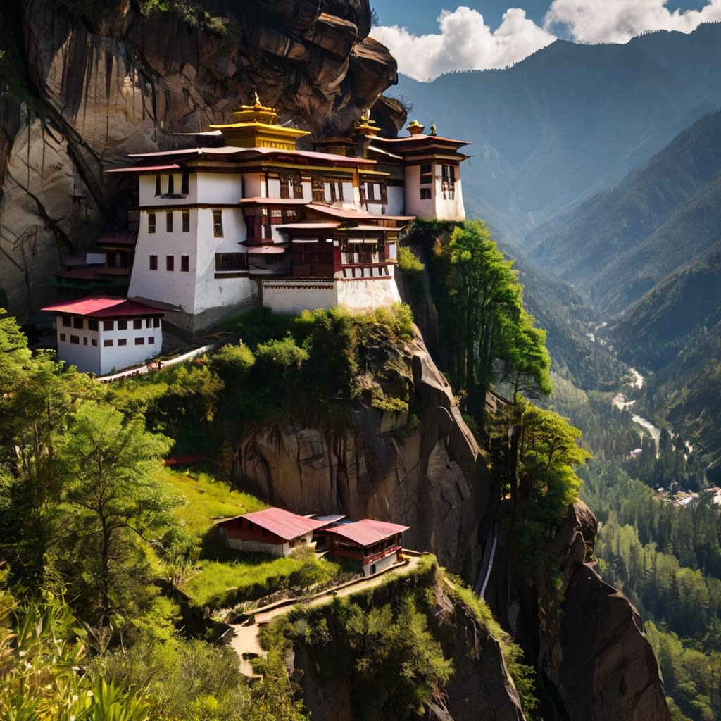A mesmerizing depiction of the Tiger's Nest Monastery, perched on a dramatic cliff in the Himalayas of Bhutan. The monastery’s vibrant white walls, red roofs, and golden spires contrast beautifully against the lush green forests and rugged mountain terrain. A peaceful trail adorned with fluttering prayer flags leads visitors through this sacred and serene landscape. This scene captures the spiritual essence and breathtaking beauty of Bhutan.