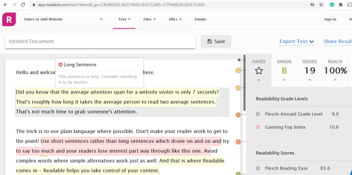 Following that, Readable's text scoring tool will let you know how easy your writing is to read and give suggestions to improve its readability.