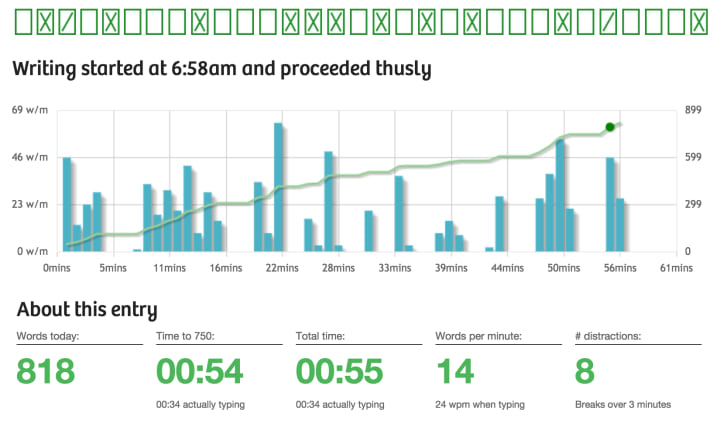 For example, every time writing, you will get detailed statistics performing the results of how often you get distracted, and how fast you write through a chart. This chart illustrates the number of words, the total time for 750 words, the number of words per minute, and the number of distractions. This will be really helpful for you to measure your efficiency in your ways of thinking and writing.