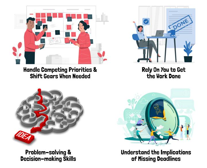 Employers want to know if you can handle competing priorities, shift gears when needed, and understand the implications of missing deadlines. They are looking to see if your coworkers can rely on you to get the work done.