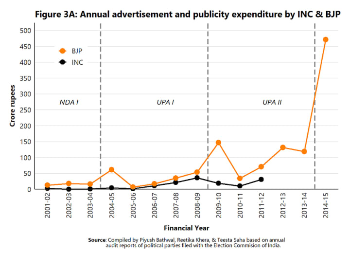 The UPA government spend around 1000 crores during the 2014 Lok Sabha elections and a similar trend is being followed by the present NDA government. This government further increased the spending. The party-wise spending on advertisement gives another perspective, Congress as a political party has never spent more than 50 crores on advertisement whereas BJP spends 472 crores during the 2014-15 period.