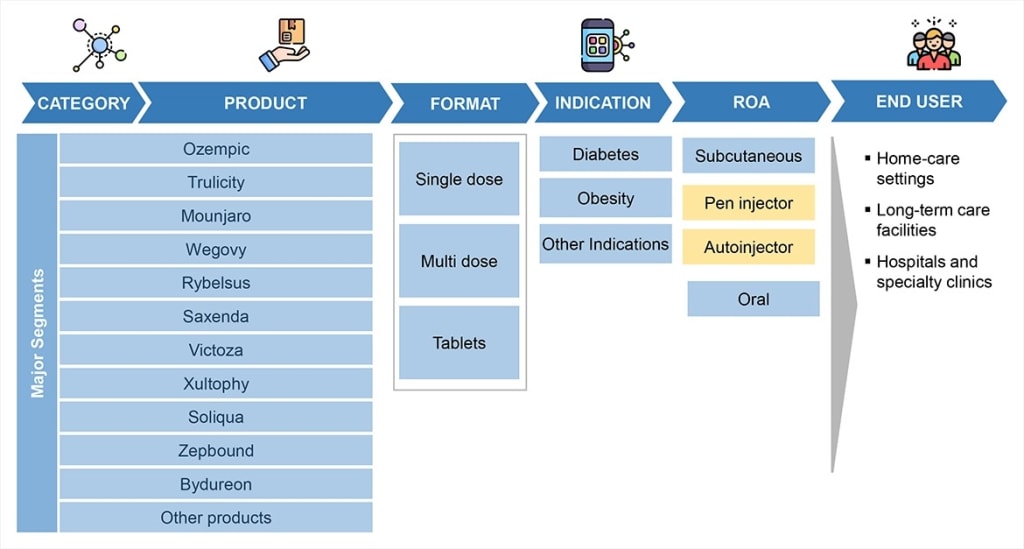 Ozempic dominated the market in 2023, primarily due to its strong brand equity, proven clinical efficacy, and wide global availability. Other leading brands include Trulicity, Mounjaro, Rybelsus, Saxenda, and Victoza.