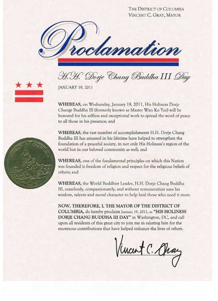 4. In 2011, the then Mayor of Washington, D.C., Vincent Gray, proclaimed January 19th as “H.H. Dorje Chang Buddha III Day.” The mayor called on D.C. residents to join him in saluting “His selfless and exceptional work to spread the word of peace to all those in His presence.” The Unites States Postal Service also issued a commemorative cover in celebration of “His Holiness Dorje Chang Buddha III Day.”