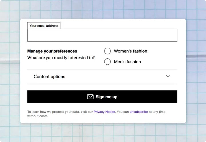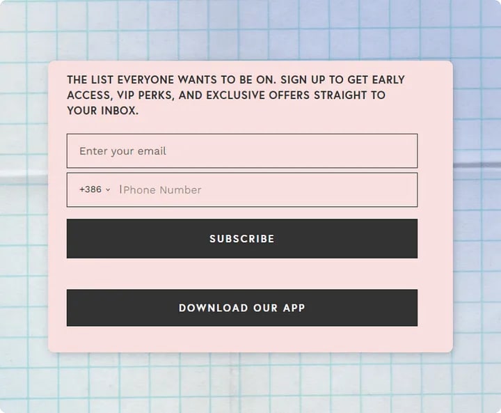 Simplify the customer journey as much as possible and reduce the time it takes to subscribe. Ideally, the process should take just a few seconds. Request only one contact detail — either an email address or a phone number. If necessary, you can also ask for a name.