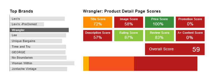 Product Intelligence tool from GrowByData gives you detailers scores into several aspects of your product’s content as well as your competitors’ product content like title, image, price, promotion, review, rating, etc. The image below shows the product detail page scores of Wranglers on their jeans products on the Walmart Marketplace. A detailed view like this helps brands understand what specific aspects of the product content needs improvements. Targeted optimizations of specific aspects mean there are no wasted efforts.