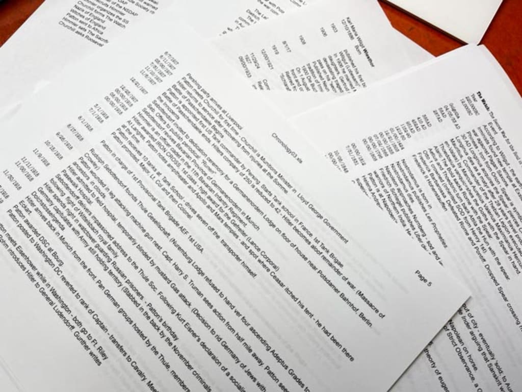 You of course, would not write such a sentence - but since I do not trust myself, I developed the 'story chronology.' My two most recent novels, "The Secret City" and "The Watch," both relied heavily on an accurate presentation of actual history. The Watch was especially dependent on my knowing exactly the timing of Adolf Hitler's journey from the flophouses and streets of Vienna to the highest position of power in pre-war Germany. So, to control my narrative as I wrote, I first prepared a story chronology. This amounted to the simplest use of the Excel application - a spreadsheet program.