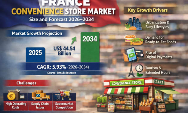 France Convenience Store Market Overview The France Convenience Store Market is entering a decisive phase of transformation, supported by urbanization, evolving consumer behavior, and a strong shift toward fast, flexible retail formats. According to Renub Research, the market is expected to expand from US$ 26.52 billion in 2025 to US$ 44.54 billion by 2034, registering a CAGR of 5.93% during the forecast period 2026–2034.