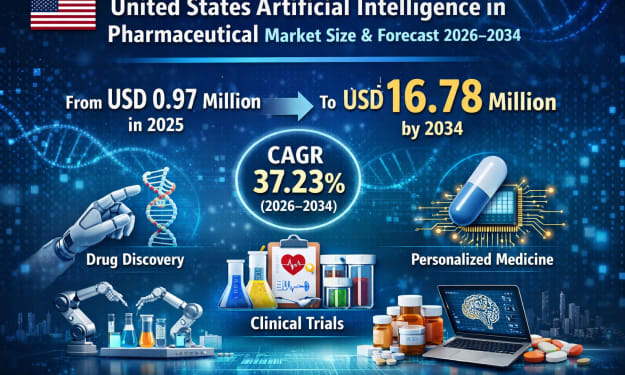 United States Artificial Intelligence (AI) in Pharmaceutical Market Overview The United States Artificial Intelligence in Pharmaceutical Industry is entering a decisive growth phase, driven by the convergence of advanced computing, biological data expansion, and urgent demand for faster, cost-effective drug development. According to Renub Research, the market is projected to expand from USD 0.97 million in 2025 to USD 16.78 million by 2034, reflecting an impressive compound annual growth rate (CAGR) of 37.23% during 2026–2034.