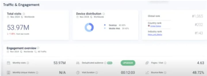 Traffic: The site receives over 1.2 million visitors monthly, with most traffic coming from organic Google searches.