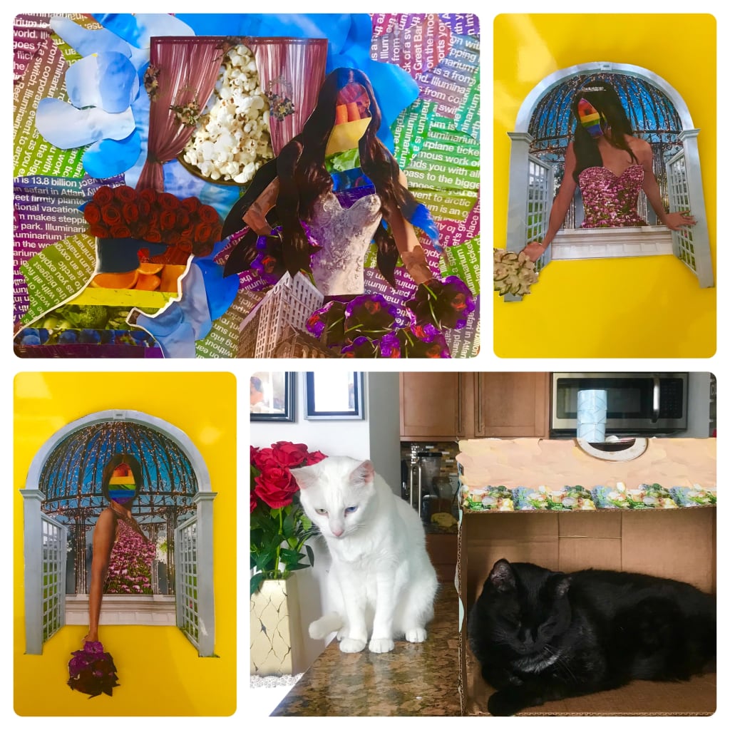 I started to feel bad for every time I threw a box out, seeing as they were the source of so much joy for Imo. I started to keep the boxes for more than just one day at a time. The only problem was that carboard didn’t exactly go with the 70’s luxury eleganza vibe I had going with my current decor. I am an artist by trade, so immediately my first thought was to decorate the boxes. However I didn’t want to use the fancy expensive acrylic paints that I had just bought. Coincidentally, I had scavenged about 25 magazines on a midnight drive in Manhattan so I figured a collage would be a great solution to covering the cardboard and being extremely cheap with materials. The plan was to start with one box and see what would happen. Little did I know, along with starting the cat house collages, I was also embarking on a journey of self-discovery which would lead me to the secret to true happiness.