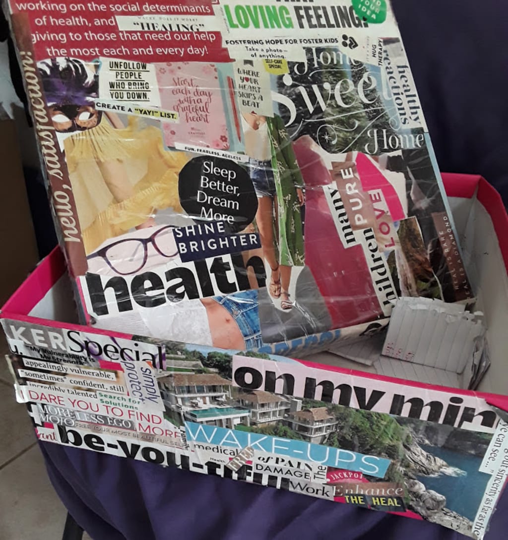 I used the “serial killer style” of mismatching magazine words and letters to tell a story around the sides of the box. I ended up with something like, “Feel anxiety take over your brain holding you back? Fight the good fight and let go. I feel soothing relief, set free. Trust works from within. You do you, fill your house. The source of miracles.” This is just one side of my box.