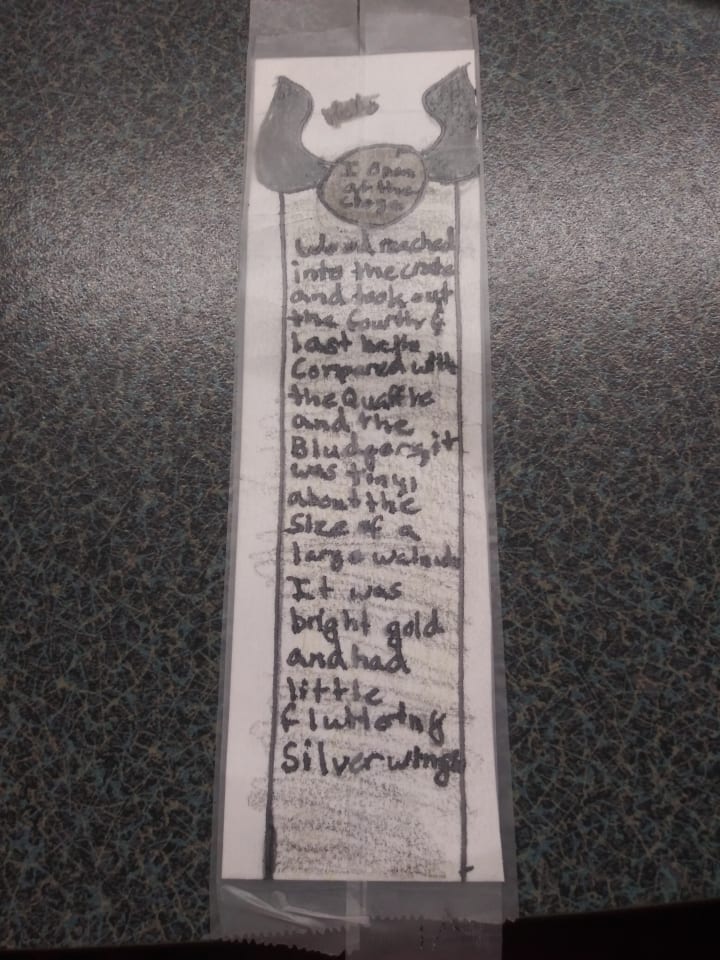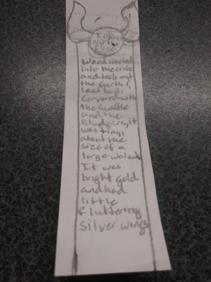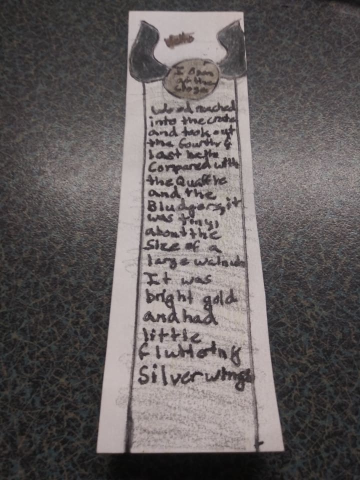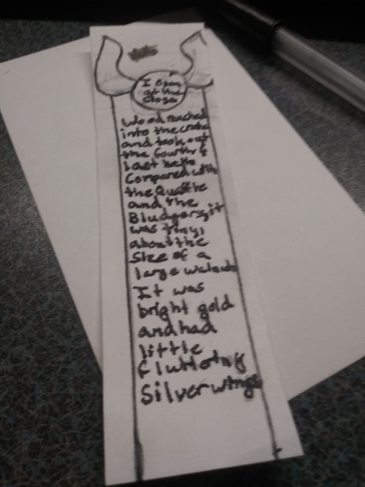 First you will want to cut your note card into two, hotdog style. You could then get two bookmarks for one note-card. Then you want to make your basic outline. As shown above, I did a snitch at the top. On the Snitch I wrote, "I open at the close"—just a little nod to when Harry discovers he had the Resurrection Stone all along during the final story. I also took a passage from when Harry is first introduced to the snitch. However, this is optional. If you want to write a passage, it will take a steady hand. Of course you could write something shorter than I did.