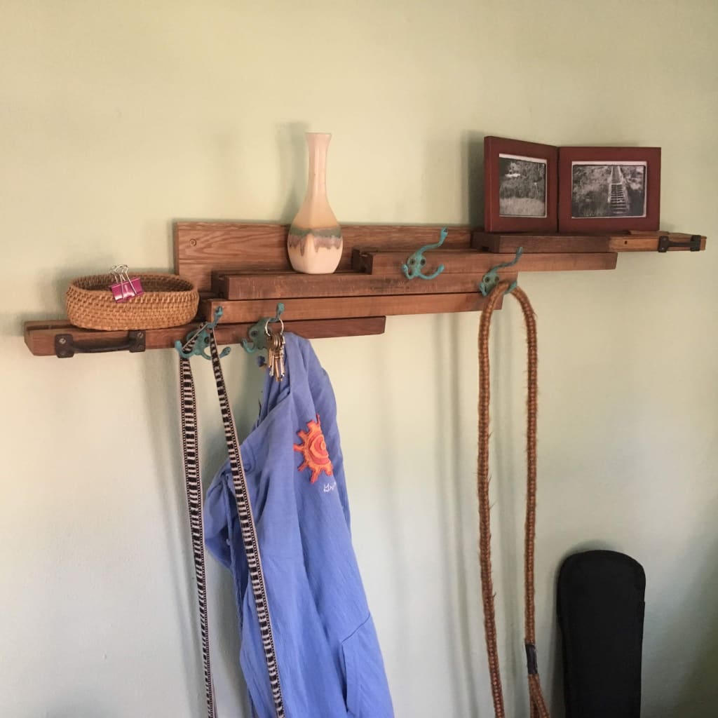 Once, at a buddy’s workshop, he handed me a couple of old oak table slides, removed from their original spots: “…here, you’ll do something with these…” Holding one, I turned it around and…Long story short, it works just as well wall-mounted, with not-new hooks attached in particular places, providing an always expandable coat/key/leash rack.