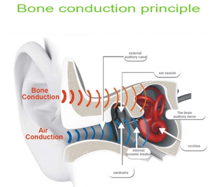 The biggest unique feature of bone conduction headphones is that sound waves do not pass through the air in the external auditory canal and eardrum, but directly use the human bone as the sound transmission medium. When using, we need to put the sound source of the headphones against the skull behind the ear. And when the sound source vibrates, it will drive the skull to vibrate together, so that the sound wave is transmitted into the skull. And then the sound wave is directly transmitted to the ossicles through the skull bypassing the external auditory canal and the ossicles. And then the ossicles transmit sound waves into the bone labyrinth, so that the sound information is transmitted to the cochlea and auditory nerve etc..