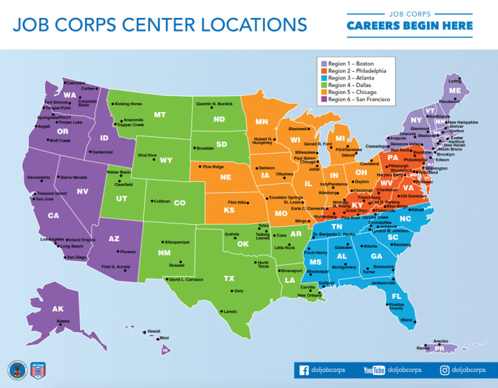There are 124 job corp locations divided into 6 regions across the U.S. nation wide.