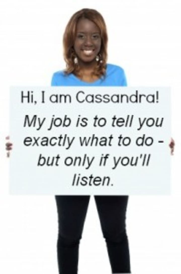 After years of trying to quite her, I am finally realising that she just will not shut up! I decided to take the advice of the old saying “if you can not beat them, then join them." I am glad I did because in getting to know Cassandra, I realized what valuable information and direction she has been giving me all these years. If we learn how to listen, Cassandra actually tells us exactly what it is that we should be doing.