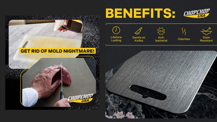 Unlike wood or plastic, titanium resists mold and bacteria growth, ensuring a hygienic surface. While titanium boards are rarer and more expensive, the long-lasting quality of ChopChop USA makes the investment worthwhile for anyone prioritizing kitchen safety and cleanliness.