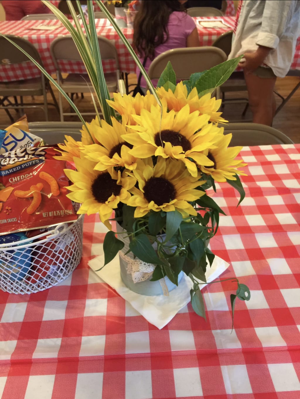 For the centerpiece above, I bought 2 bunches of dollar store sunflowers for $1.00 per bunch and then I scavenged my back yard for green plants to cut and add to the arrangement to give it a fresh flower look. I ended up deciding on some tall grass looking thing (Iām not a plant expert) and some pretty green vines that were plentiful in my backyard. I simply arranged them as I normally would a completely fresh-cut arrangement and that was it! The nice thing about this way of doing things is that you can do the arrangements the night before and not worry about the flowers wilting!