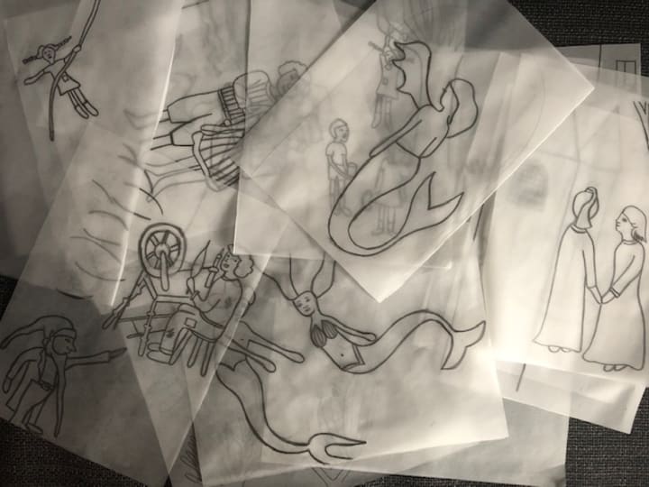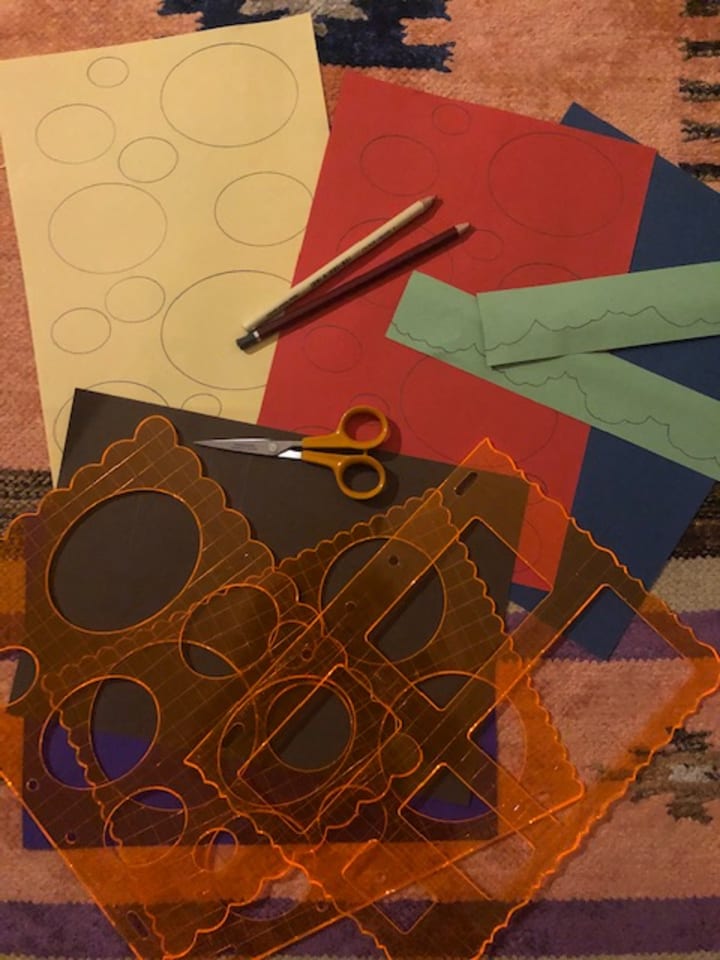 Step five: you can use your stencils or free draw circles, rectangles, and other shapes. Maybe you want to design characters and scenes in a sketchbook. You might want to then use tracing paper to draw out your characters and then transfer them to your selected material.