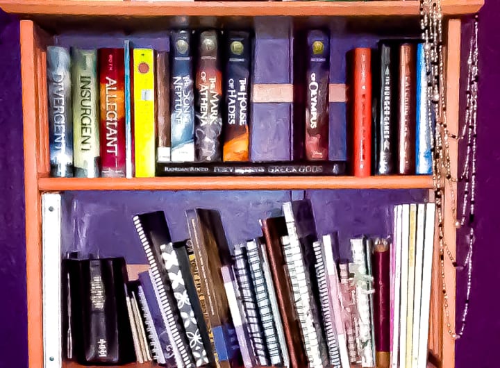 A coral, foldable bookshelf that me and my dad thrifted from a flea market. A place to hold the friends I had made in my favourite worlds trapped between pages.