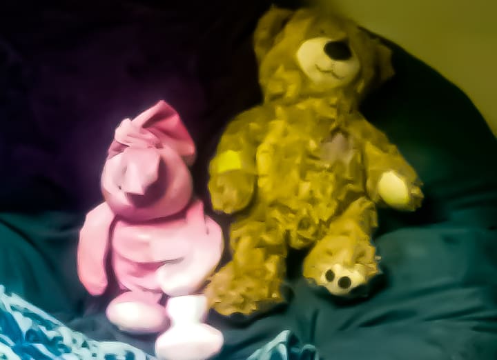 Sarah Bunny, a pink rabbit tattooed in stitches to keep her from falling apart. She was given to me by my mother shortly after my parent’s divorce so that I could always have her with me. Her ears hold an ocean of my tears and have been witness to my greatest fears.