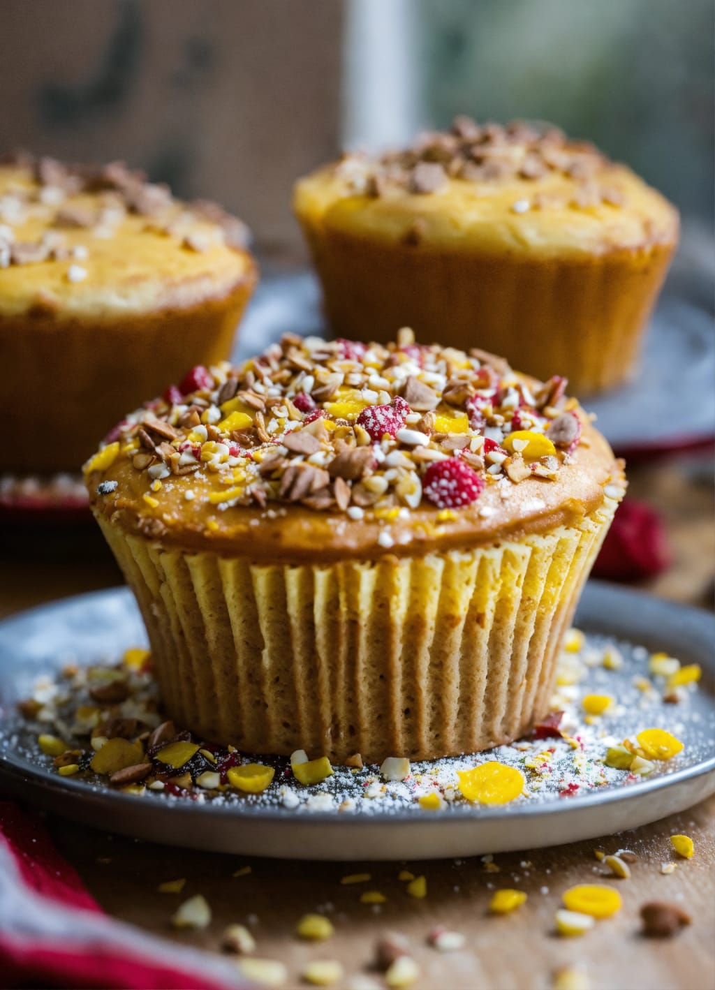 Sprinkle the chilled almond crumble generously over the top of each muffin.
