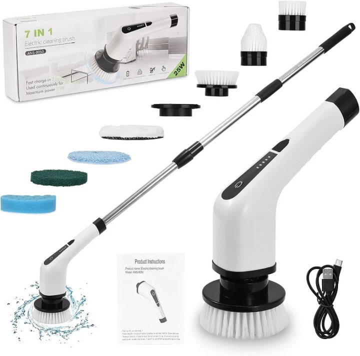 7-in-1 Electric Spin Scrubber This multifunctional electric spin scrubber comes with is equipped with 7 heads to clean internal and external floors, tiles, rugs, bathtubs, kitchen, sinks, as well as car polishing. A scrubbing brush is ideal for stubborn stains and irregular surfaces, such as kitchen and bathroom grout. The drill head brush cleans the cracks and corners that are difficult to reach.it costs 45.89£, you can see further info on this porduct in the link down below.