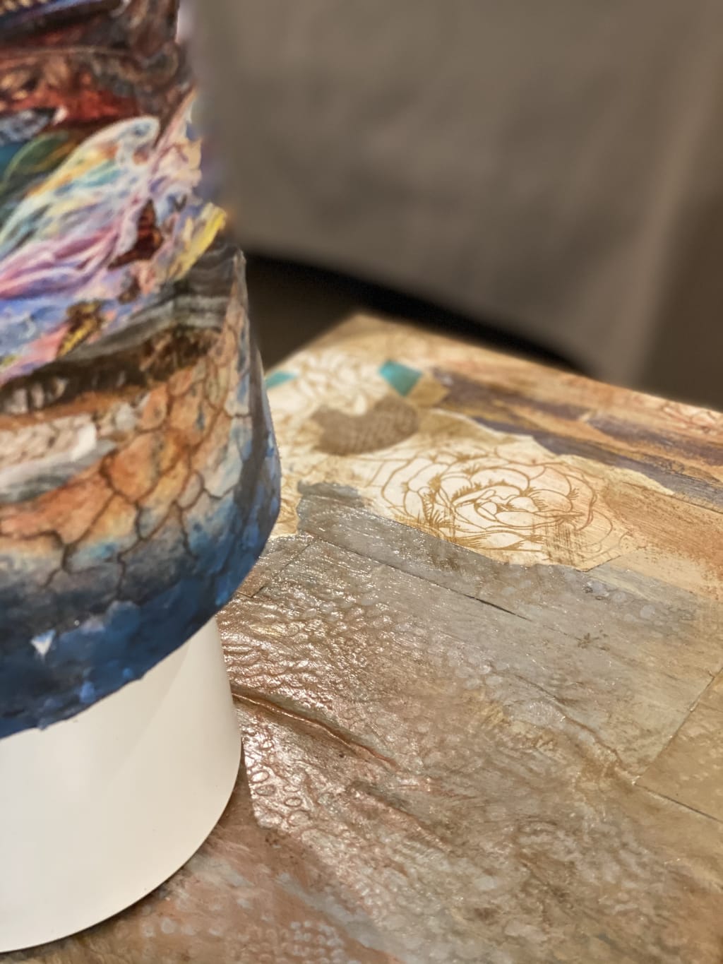 Oddly enough, I can draw and I can carve. These pictures are all first attempts. It is my sister's influence. Her gift in me. She gave me a sense of color, too, but it is my own. I can't do simple like her. I love collage and decoupage because it "contains multitudes" (Walt Whitman reference)). It contains my crazy love/hate affair with scissors. It contains my sister. And it contains me. It heals us both and weaves our stories together. This Midas touch is sustained by authenticity and love. I don't know if I will ever be able to sell enough to cover my time, but I think I might invest in a few good pairs of scissors and try to learn to cut someday.