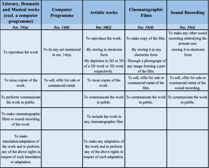 These rights may vary depending upon the type of work you have created. For Example, the producer of a film will have different rights as compared to a computer programmer. Section 14 of the Copyright Act, 1957 lists the exclusive rights of the copyright owners under different categories of copyrightable works. You can refer to the table below for an easier understanding of this section.